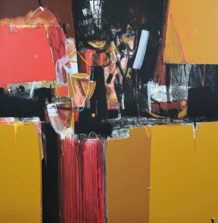 The lack of boundary, the use of monochromatic colours, draws a viewer to its depth of visual language thus giving a glimpse of the artist’s mind and his inner world. The viewer is left with a sublime effect yet feeling restless in the abundant energy that his stylized abstract paintings exude.